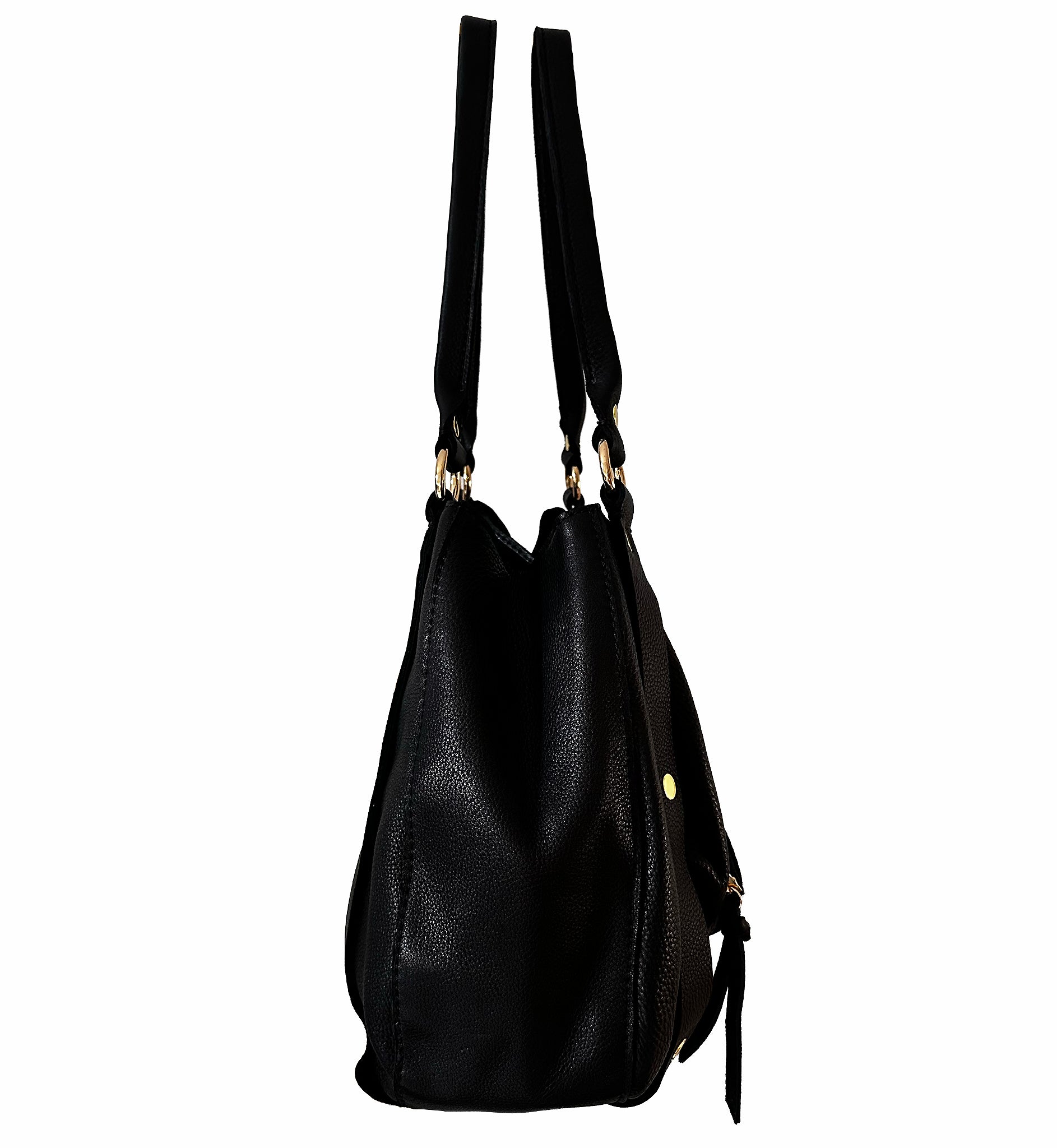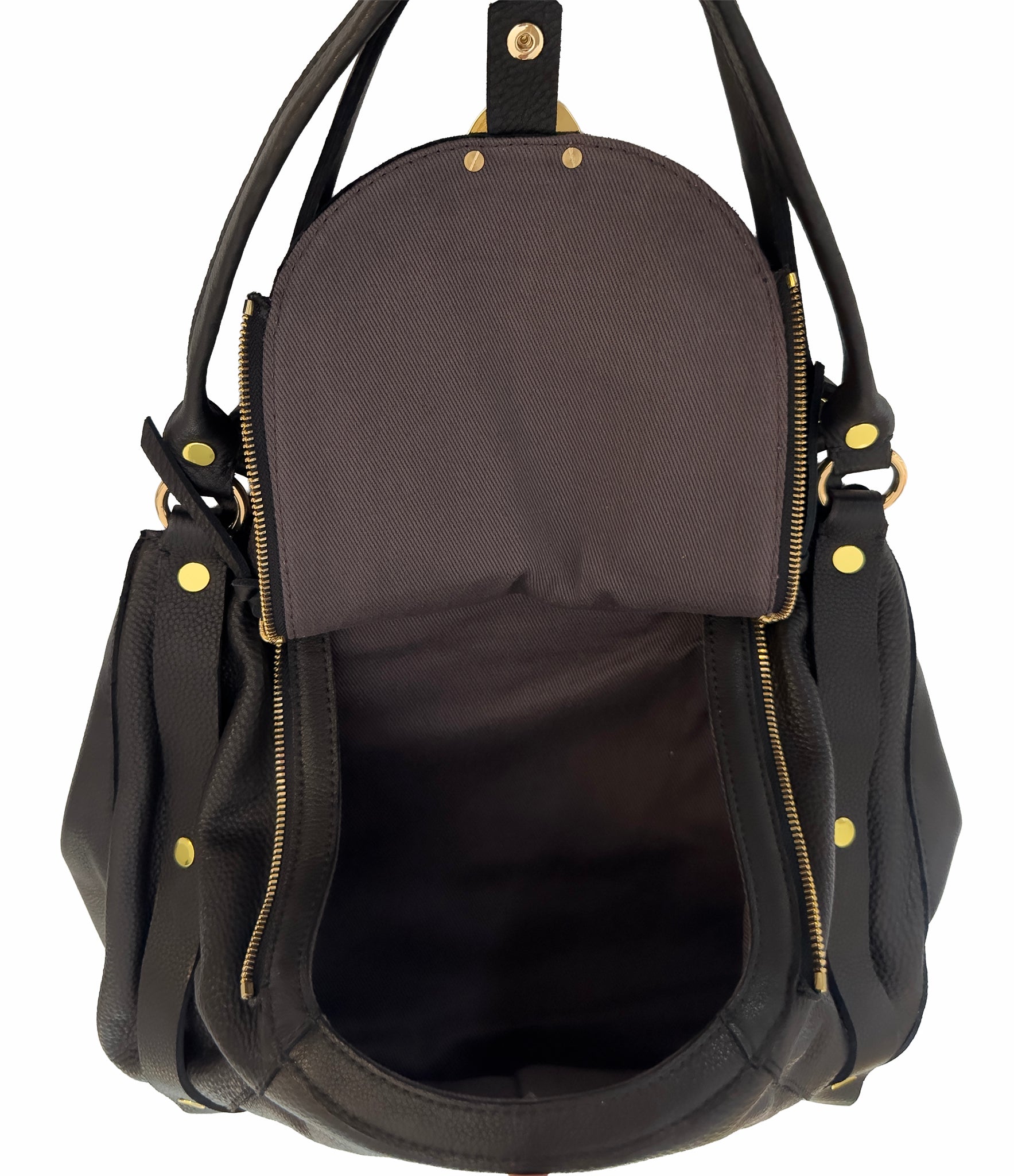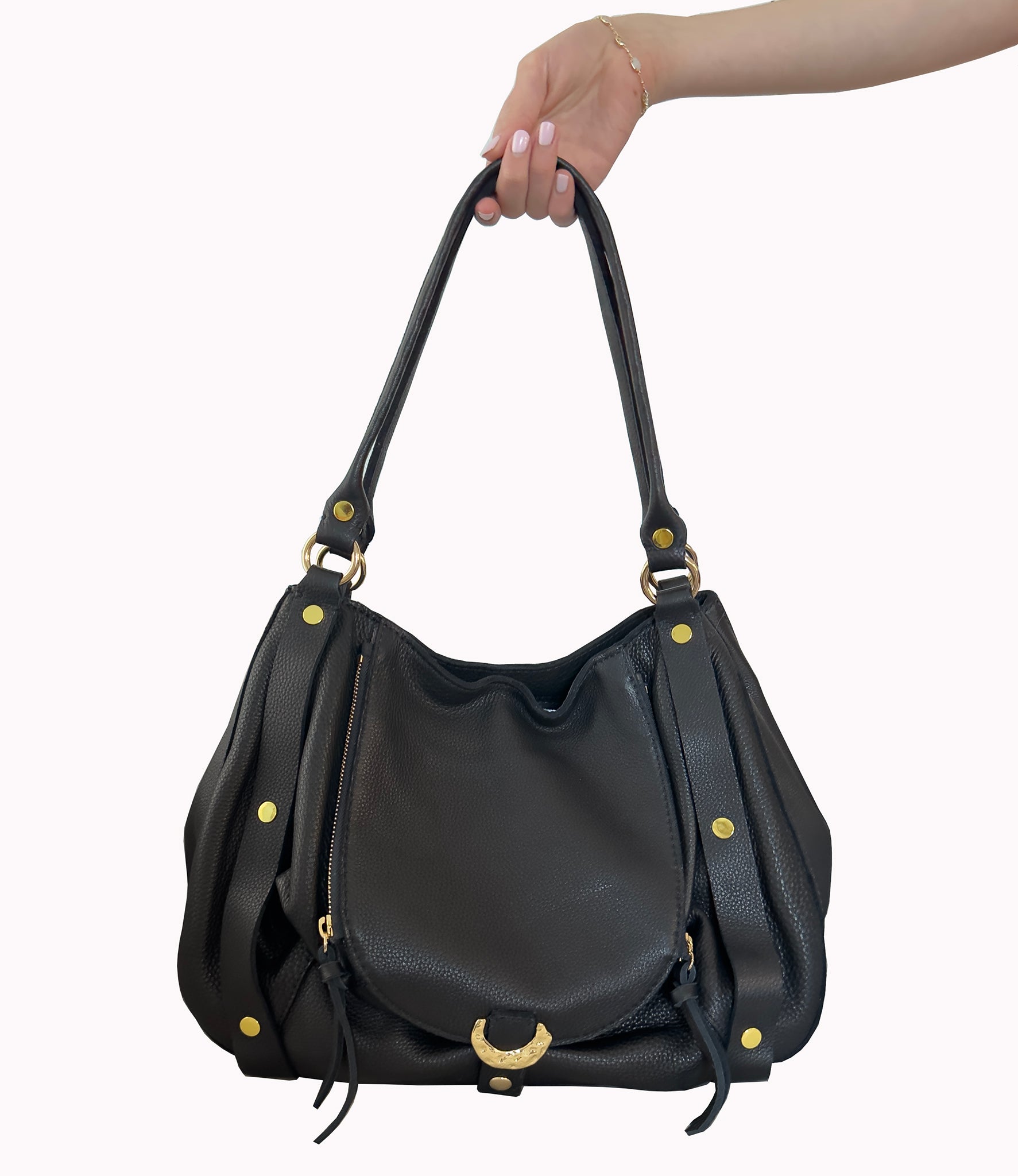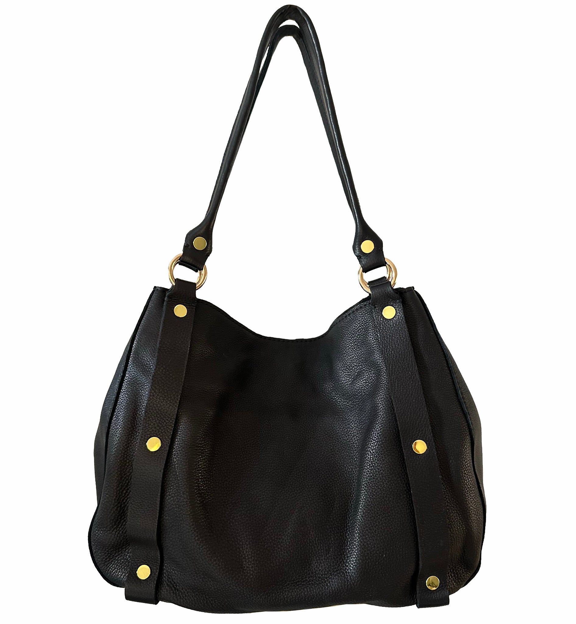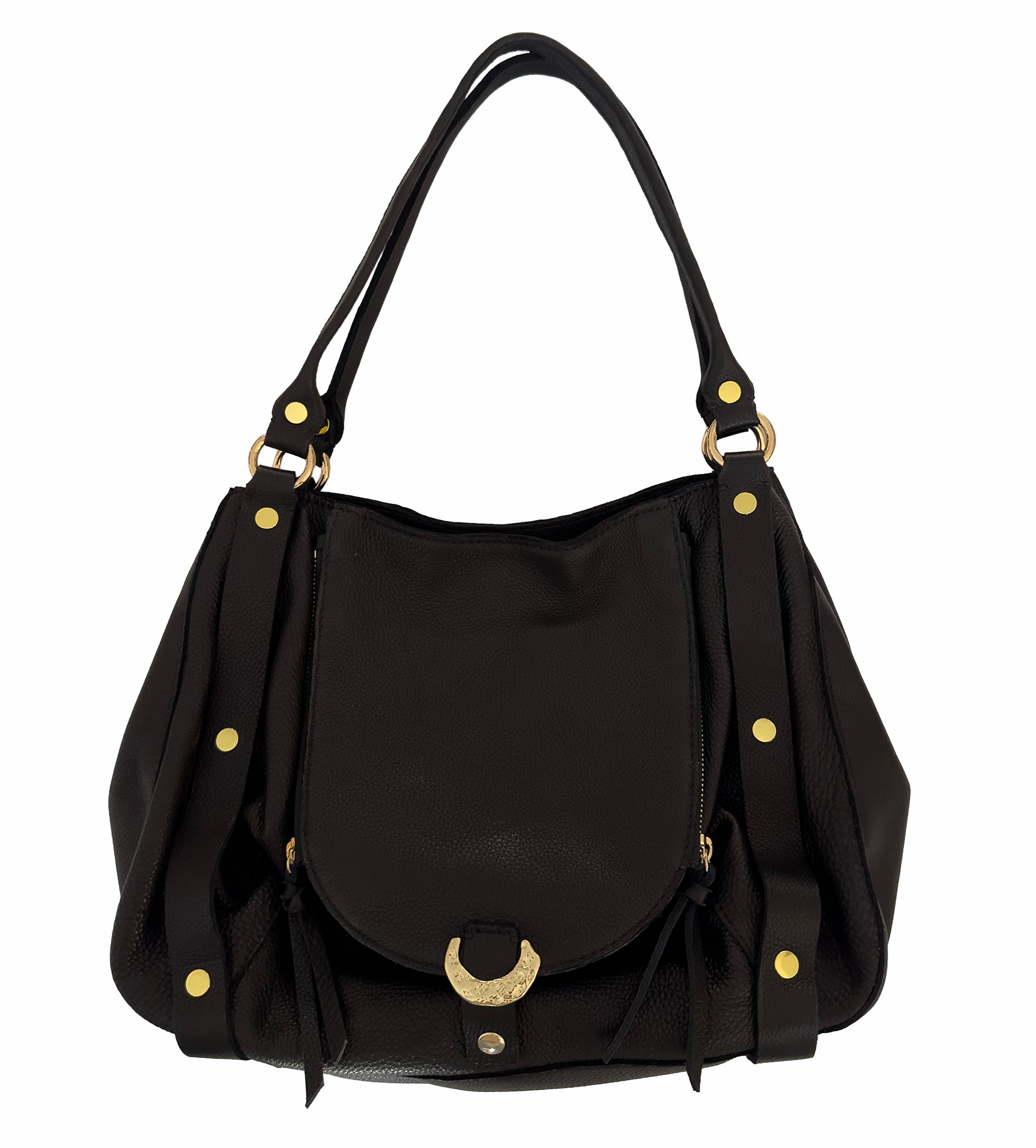 Statement straps detailed with gold studs, give this satchel its unmistakable attitude. It's functional, yet undeniably cool.