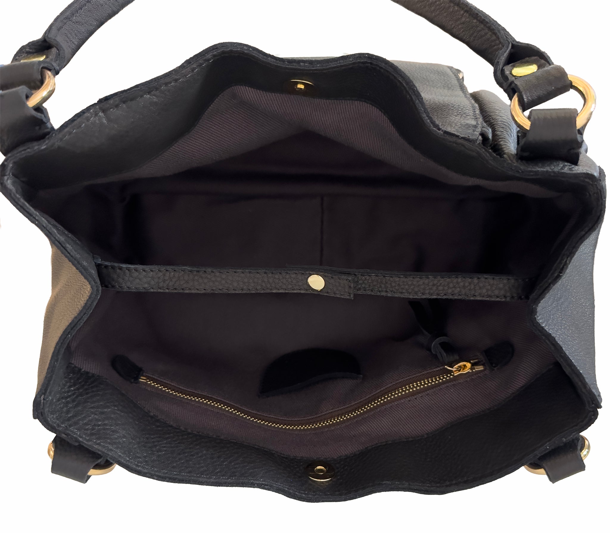 Crafted from buttery-soft full grain leather and finished with gold hardware. The bag was designed to carry more than just essentials — and provides extra hidden storage.